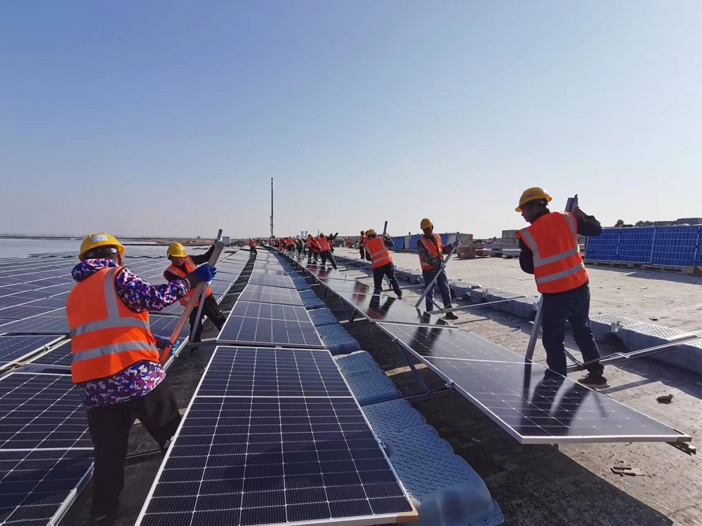 淮北礦業集團加快發展光伏“綠電”戰新產業補鏈項目。在面積達94公頃的袁店一礦84兆瓦集中式水面光伏項目現場,120名職工分成6個班組,從南北兩岸正加快施工?!绊椖拷ǔ珊?,平均每年提供綠色電能9311萬千瓦時,相對火力發電,每年節省標煤2.84萬噸,相應減少排放二氧化碳7.58萬噸?!痹摴夥椖拷ㄔO負責人秦忠原介紹。