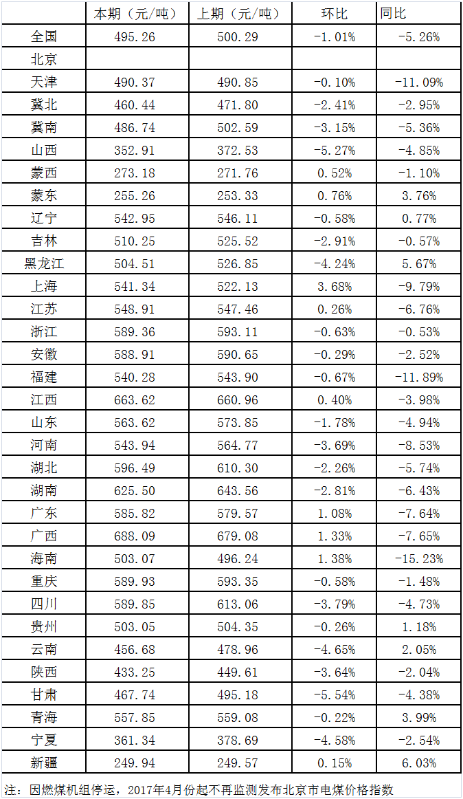 2019年5月15日,國家發(fā)展改革委價格監(jiān)測中心公布4月中國電煤價格指數(shù)為495.26元/噸,環(huán)比下行1.01%,同比下降5.26%。其中,監(jiān)測的31個省市(不含北京市)中,價格下行地區(qū)數(shù)量有22個,下行幅度減弱至27.44元/噸以內(nèi);其他9個地區(qū)電煤價格全部上行,漲幅上行至19.21元/噸以內(nèi)。本月全國煤炭價格活動范圍整體上移,且煤炭價格上下行地區(qū)數(shù)量比例基本維持,說明價格下行區(qū)域活力減弱,而上行幅度擴(kuò)大。